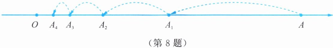 8. 如图,一跳点P从距原点1个单位的点A处向原点方向跳动,第1次跳到点$A_1$处(点$A_1$到原点O的距离是点A到原点O距离的一半),第2次跳到点$A_2$处(点$A_2$到原点O的距离是$A_1$到原点O距离的一半),如此不断跳下去……问:第1次跳动后,点P到原点的距离是多少?第2次跳动后呢?第10次跳动后呢?