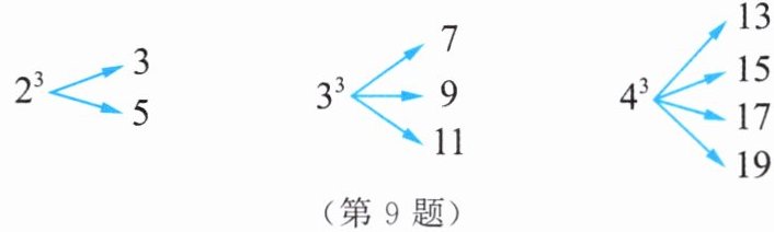 9. $2^{3},3^{3}和4^{3}$分别可以按如图所示方式“分裂”成2个、3个和4个连续奇数的和,类似地,$6^{3}$也能按此规律进行“分裂”。$6^{3}$“分裂”出的奇数中,最大的是(