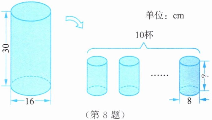 8. 如图,现有底面直径为16 cm,高为30 cm的圆柱形容器,里面装满了果汁。小方把果汁分装到10个高度相等且底面直径都为8 cm的圆柱形杯子里,每个杯子刚好装满。算一算,杯子的高度是多少?