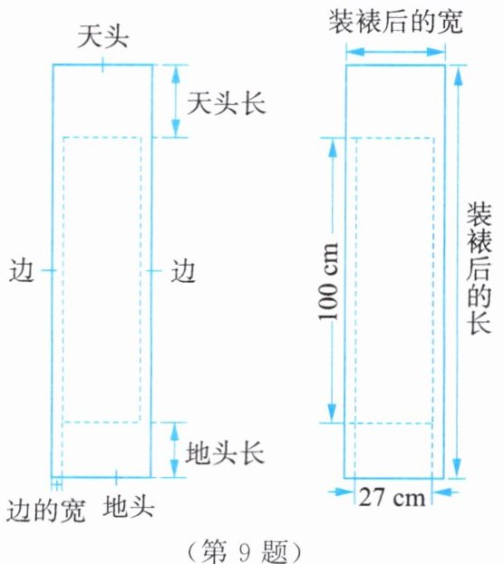 9. 对联是中华传统文化的瑰宝。某对联装裱后,如图所示,上、下空白处分别称为天头和地头,左、右空白处统称为边。一般情况下,天头长与地头长的比是6:4,左、右边的宽相等,均为天头长与地头长的和的1/10。某人要装裱一副对联,对联的长为100 cm,宽为27 cm。若要求装裱后的长是装裱后的宽的4倍,求边的宽和天头长。