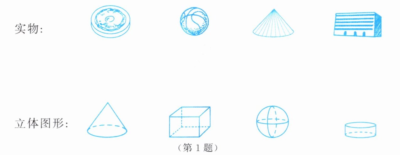 1. 找出与下面立体图形相似的实物,用线连起来。