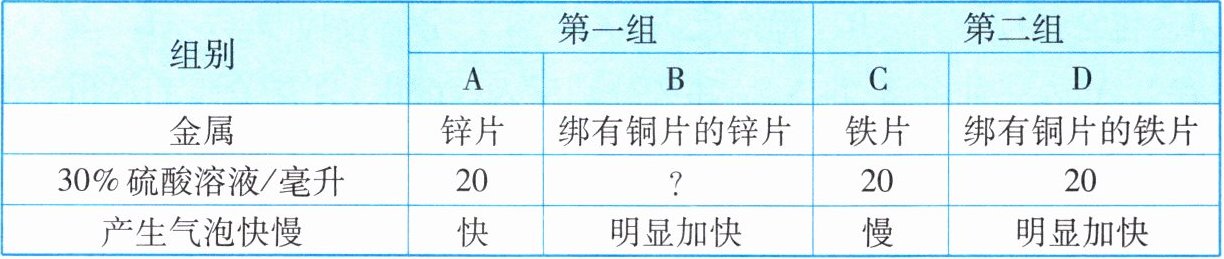 7. 某同学在整理实验器材时,将还在反应的锌和稀硫酸的残留物,倒入有少量硫酸铜溶液的废液缸中,观察到锌粒表面产生气泡的速度大大加快。与硫酸铜溶液混合怎么会加快锌和稀硫酸的反应速度呢?对此,他查阅资料得知:①相互接触的两种活动性不同的金属,同时放入酸中,活动性较强的金属与酸反应产生氢气的速度会大大加快。②硫酸铜对锌和稀硫酸反应没有催化作用。然后,该同学根据下表进行实验,观察并记录现象。