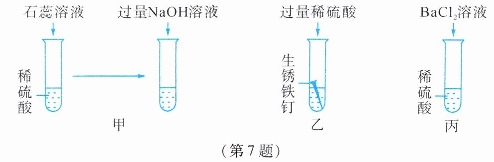 7. 如图是为了验证稀硫酸的化学性质所做的三个实验,请回答下列问题。