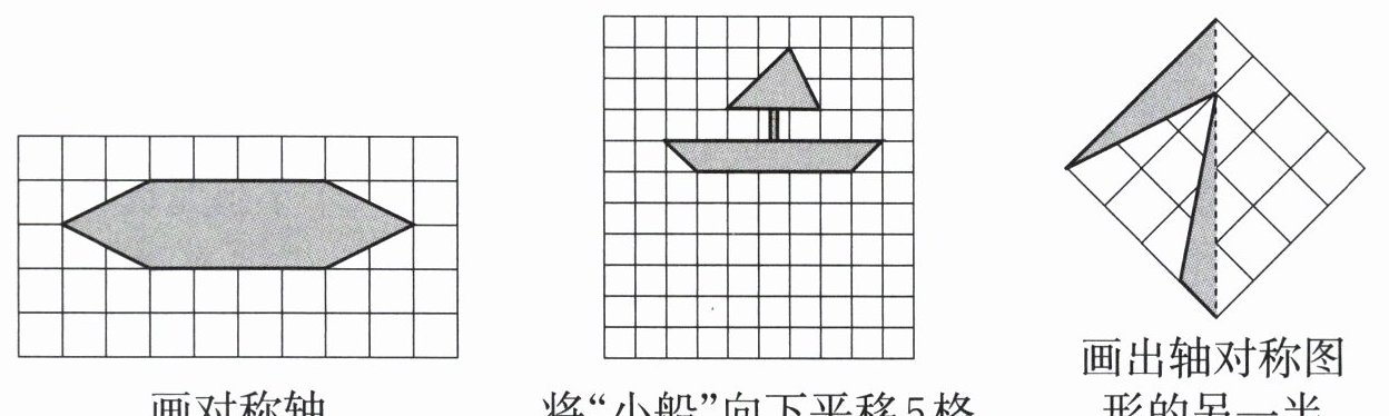 平移图形:对于“小船”图形,将其每个顶点都向下平移5格,然后依次连接这些平移后的顶点,得到平移后的“小船”图形。