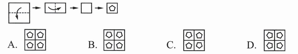 (2) 如下图,把一张正方形的纸对折两次后,在中间剪去一个正五边形,展开后得到的图形可能是( )。