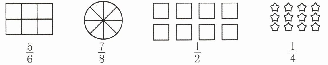 观察第一个图形,它被平均分成了$6$个小正方形,根据分数的意义,分母表示平均分成的份数,分子表示取的份数,所以$\frac{5}{6}$表示要涂$5$个小正方形。