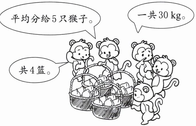 (1)求每只猴子能分到多少千克桃子,就是把$30$千克桃子平均分给$5$只猴子,用桃子的总重量除以猴子的数量即可。