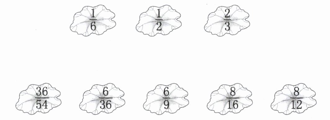 答案:$\frac{1}{6}$与$\frac{6}{36}$相连;$\frac{1}{2}$与$\frac{8}{16}$相连;$\frac{2}{3}$与$\frac{36}{54}$、$\frac{6}{9}$、$\frac{8}{12}$相连。
