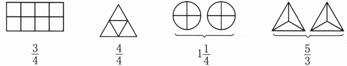 第四个图形是两个相同的大三角形,每个大三角形被平均分为3份,需要涂色表示$\frac{5}{3}$。