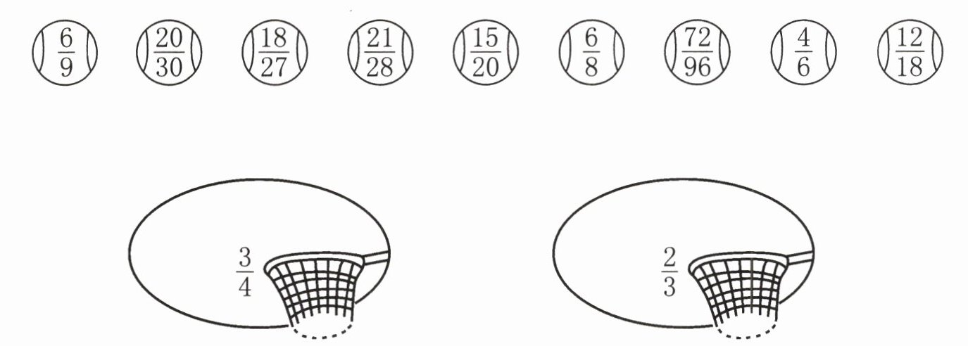 答案:$\frac{6}{9}$、$\frac{20}{30}$、$\frac{18}{27}$、$\frac{4}{6}$、$\frac{12}{18}$连$\frac{2}{3}$;