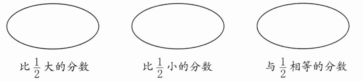 故答案为:比$\frac{1}{2}$大的分数:$\boldsymbol{\frac{30}{45},\frac{9}{12},\frac{9}{5}}$;比$\frac{1}{2}$小的分数:$\boldsymbol{\frac{6}{21},\frac{3}{7}}$;与$\frac{1}{2}$相等的分数:$\boldsymbol{\frac{25}{50},\frac{7}{14}}$。