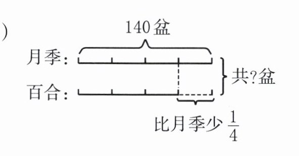(2)解析:本题考查分数的混合运算。从图中可知,月季有$140$盆,百合比月季少$\frac{1}{4}$,需要先算出百合比月季少的盆数,再用月季的盆数减去少的盆数,得到百合的盆数,最后将月季和百合的盆数相加,得到总盆数。