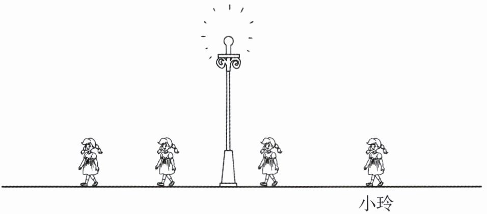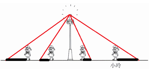 小玲离路灯越近,影子越短;离路灯越远,影子越长。