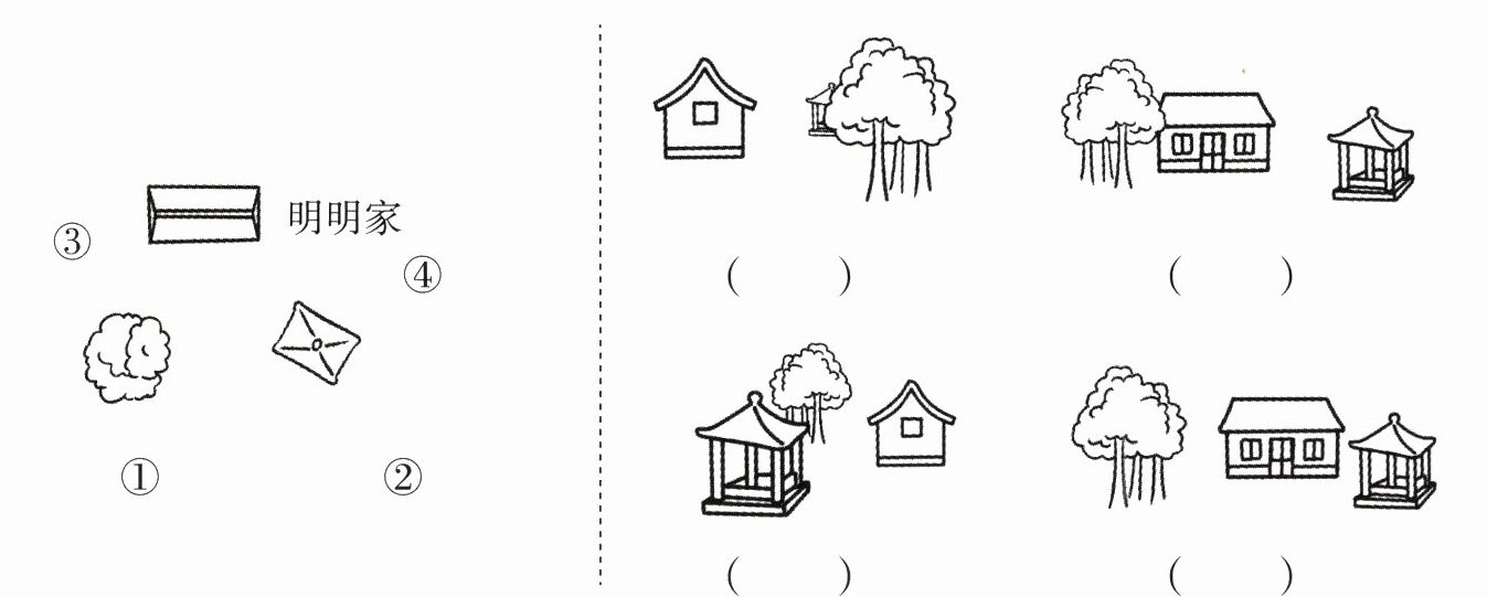 2. 下面左图是从空中看到的明明家,房子周围有几棵大树,还有一个亭子。右边四幅图分别是站在哪个位置看到的?填一填。(填序号)