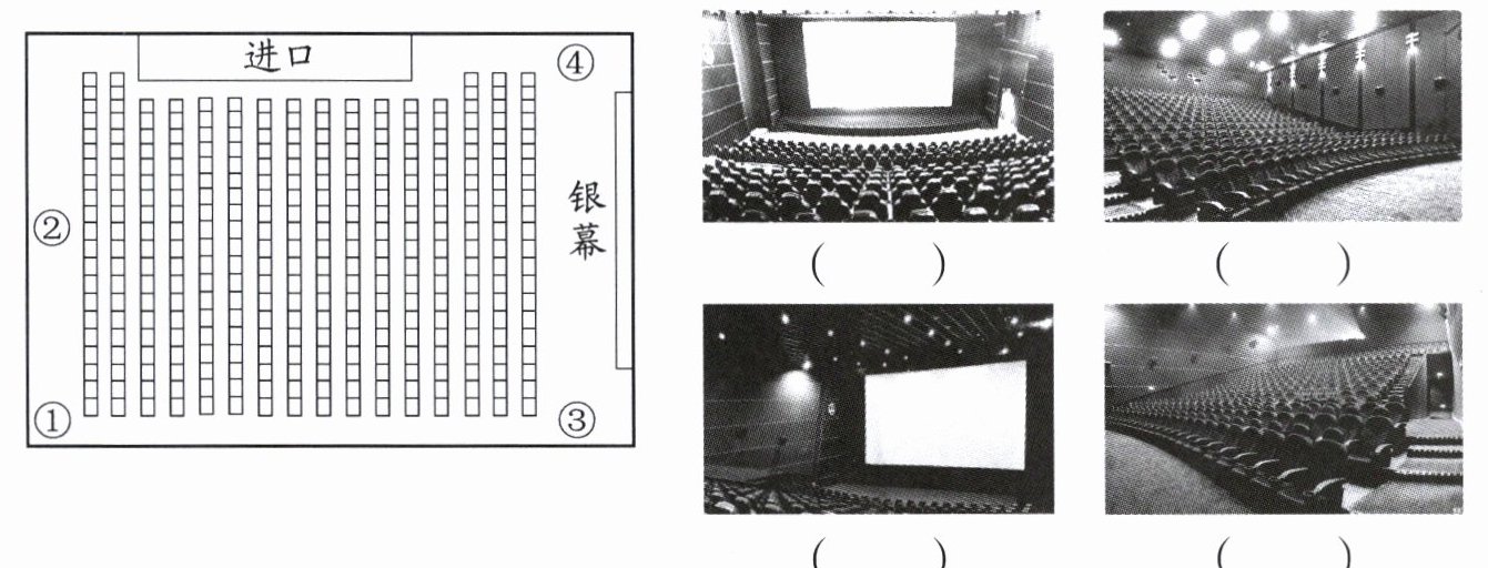 4. 下面左图是某电影院A厅平面图。右边的4张照片分别是在①②③④号位置拍摄的。请在各照片下面的括号里填上合适的序号。