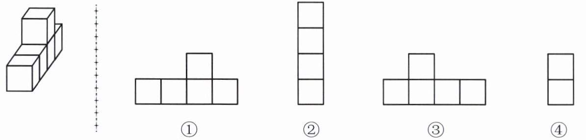1. 下面左边的立体图形是由5个小正方体搭成的。从不同角度观察这个立体图形,得到下面四种不同的图形。