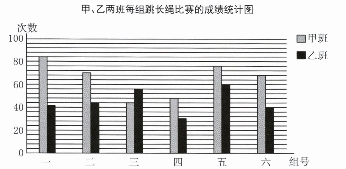 2. 六年级举行跳长绳比赛,每个班级分成六个小组,下面是甲、乙两班每组比赛的成绩统计图。