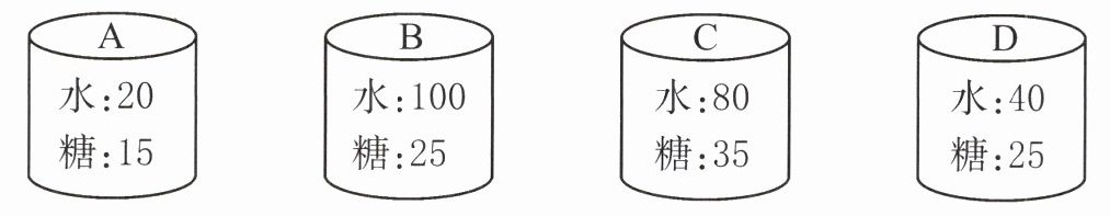 D杯:糖$25g$,水$40g$,糖和水的质量比是$25:40=5:8$,比值是$\frac{5}{8}=0.625$。