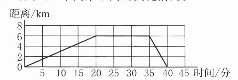 1. 王军乘公交车从家出发,去离家6km远的图书馆。他借完书后乘出租车回家。下图表示在这段时间里王军离家距离的变化情况。