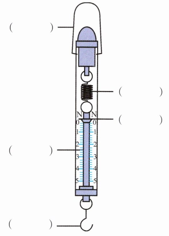 1. 观察下图中的弹簧测力计,并填写各部分的名称。