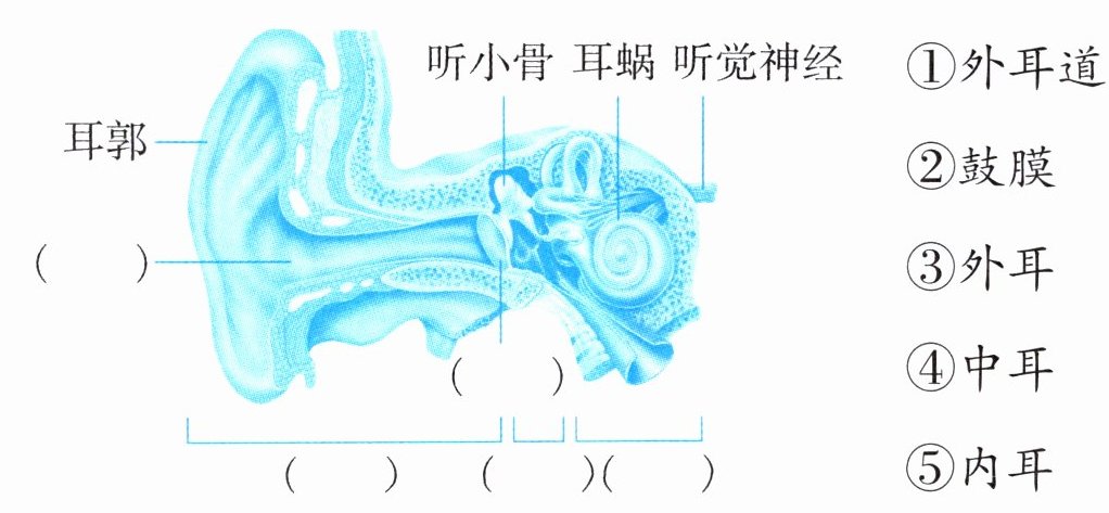 【解析】:本题考查耳朵的结构,根据耳朵结构图可知,最外面的是外耳,外耳包括耳郭和外耳道,耳郭主要起到收集声音的作用,外耳道则是声音传导的通道;往里面是中耳,中耳有鼓膜、听小骨等结构,鼓膜在声音传导过程中会振动,听小骨起到放大和传递振动的作用;最里面是内耳,内耳有耳蜗等结构,耳蜗与听觉神经相连,能将声音信号转化为神经冲动。