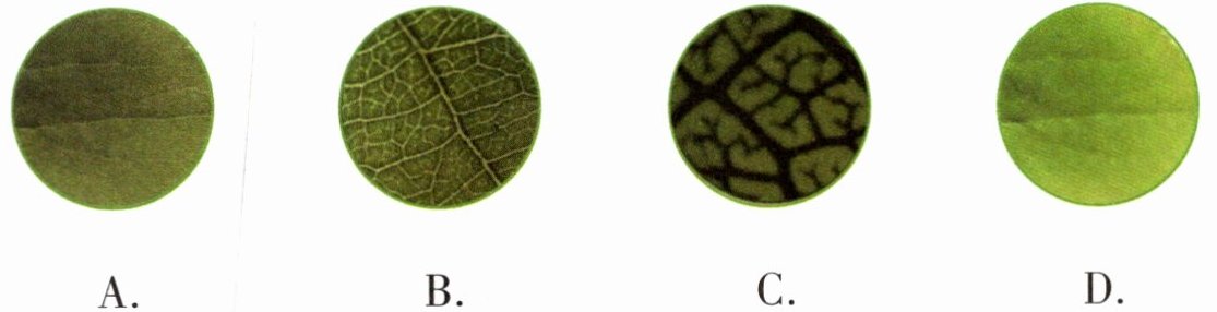 【解析】:本题考查显微镜放大倍数与观察图像的关系。显微镜的放大倍数越大,看到的细胞就越大,细胞数目越少,视野范围越小,图像越清晰但视野越暗。观察图中四个选项,C选项中叶子的细胞结构最清晰,细胞细节最明显,说明其放大倍数最大。
