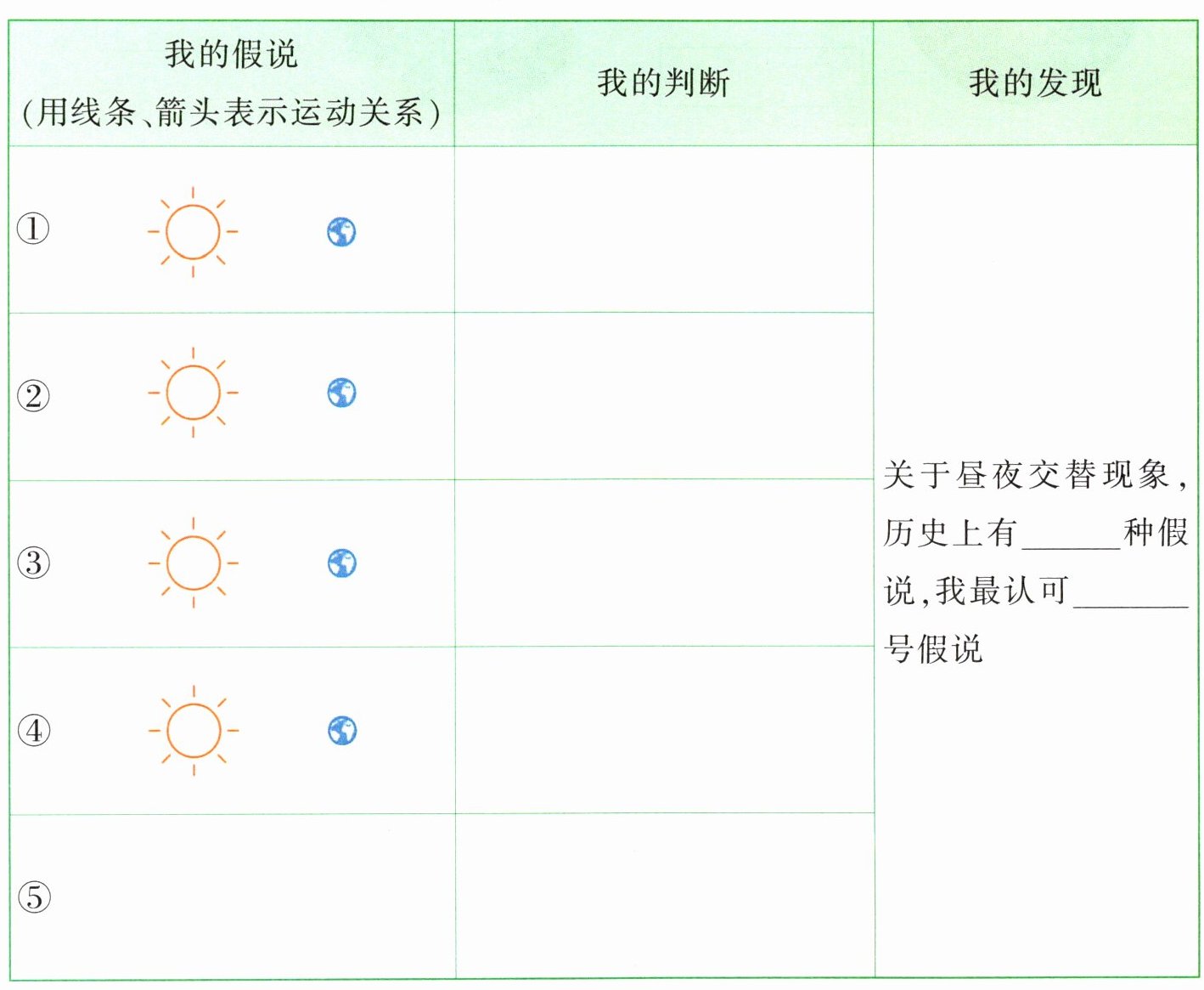 |②太阳不动,地球绕太阳转(地球绕太阳画圆圈,箭头表示转动方向)|不能很好地解释昼夜交替的周期性| |