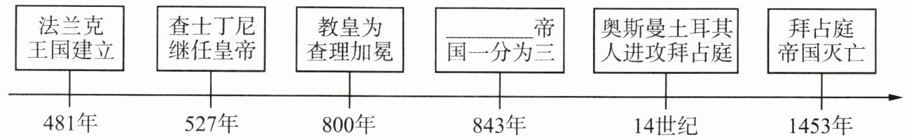 | 法兰克王国建立 | 查士丁尼继任皇帝 | 教皇为查理加冕 | ______帝国一分为三 | 奥斯曼土耳其人进攻拜占庭 | 拜占庭帝国灭亡 |