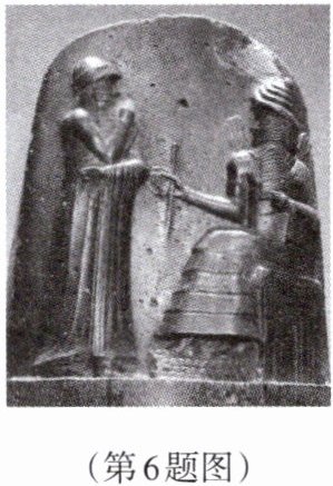 6. 右图所示石柱浮雕描绘的是古巴比伦人的太阳神沙玛什向国王汉谟拉比授予权杖的画面,其寓意是 (