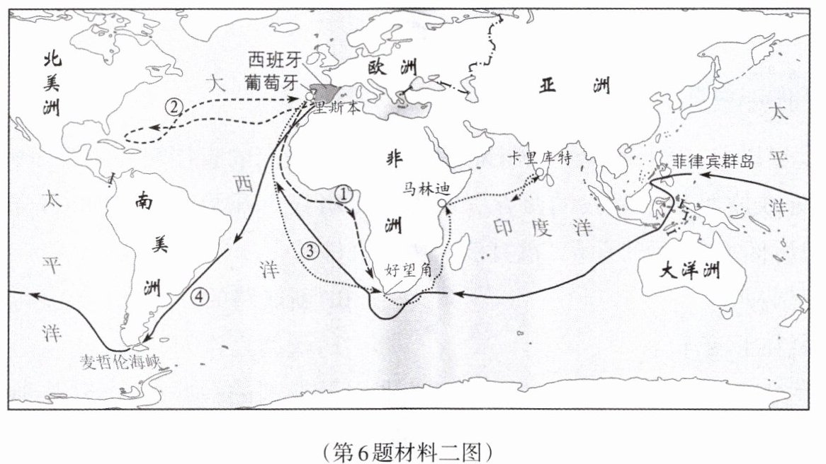 (2)观察材料二中的图,判断①②③④四条航线中,最先到达东方的航海家是______(填航海家名字),其开辟的航线是______(填序号)。