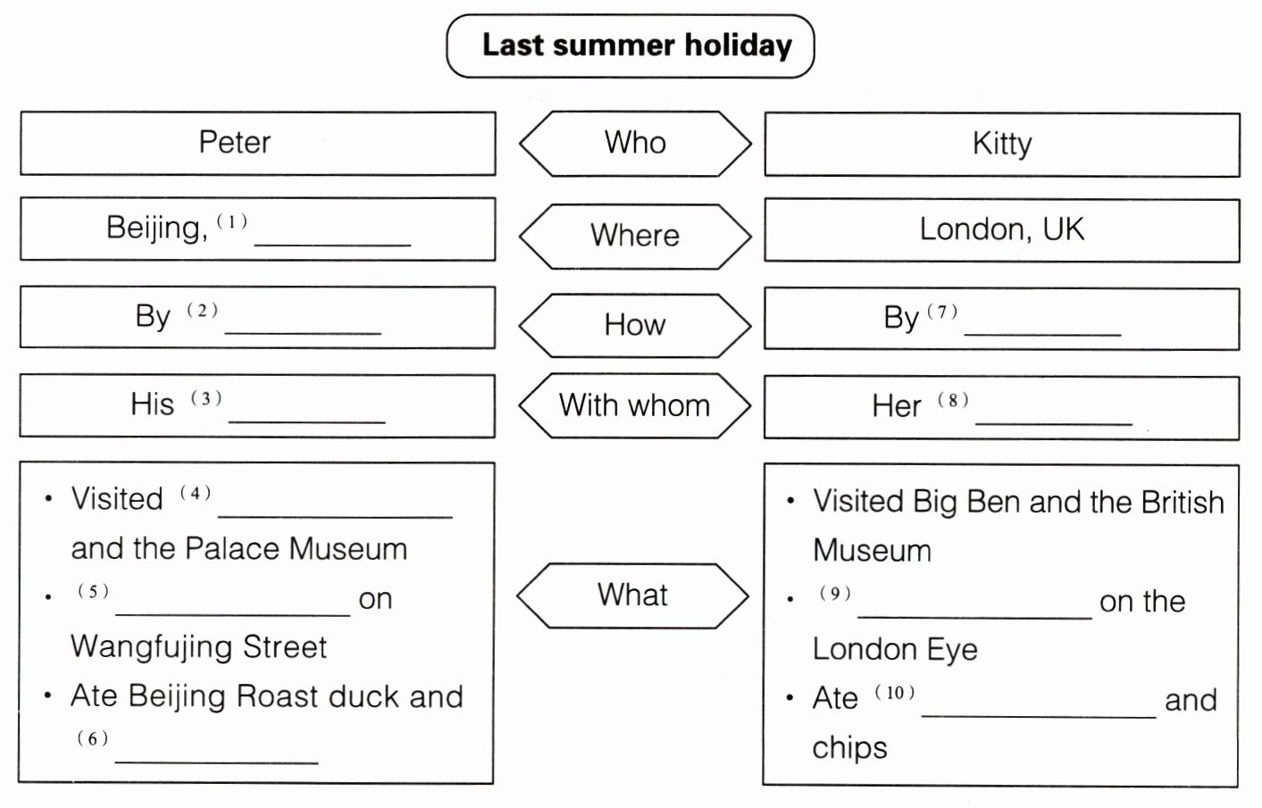 1. China 2. train 3. e-friend 4. the Great Wall 5. went shopping 6. dumplings 7. plane 8. family 9. took photos 10. fish
