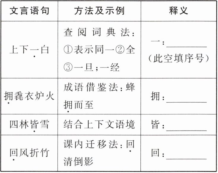 为了更好地读懂文本,同学们就文言文学习的方法展开了讨论,请你结合以上文本,将下表补充完整。