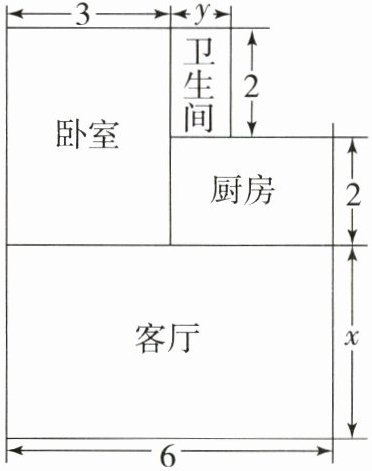 22. (10 分)小王购买了一套经济适用房,他准备将地面铺上地砖,地面结构如图所示.根据图中的数据(单位:m),用含$x$,$y$的代数式表示地面总面积.