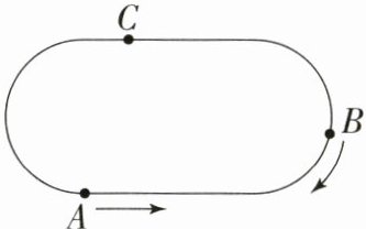 17. 如图,点 $A,B,C$ 把一条 $300$ 米长的环形跑道分为相等的 $3$ 段. 若甲、乙两人分别从 $A,B$ 两处同时相向出发,甲每秒跑 $3$ 米,乙每秒跑 $2$ 米. 相遇后不改变方向,经过 $800$ 秒时,两人恰好第