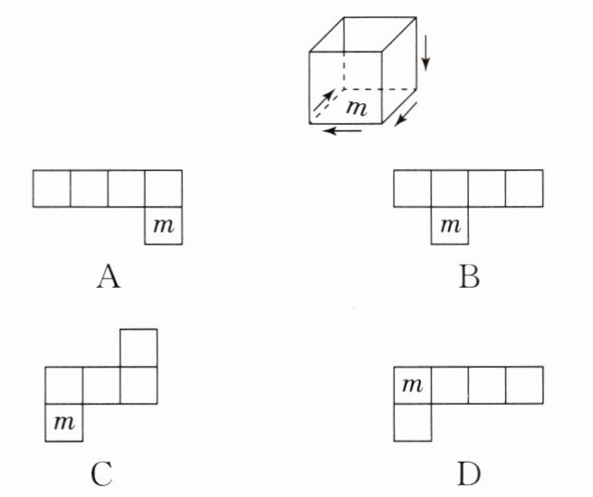4. 如图是一个无盖正方体盒子,盒底标有一个字母 m,现沿箭头所指方向将盒子剪开,则展开后的图形是(