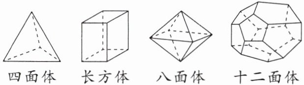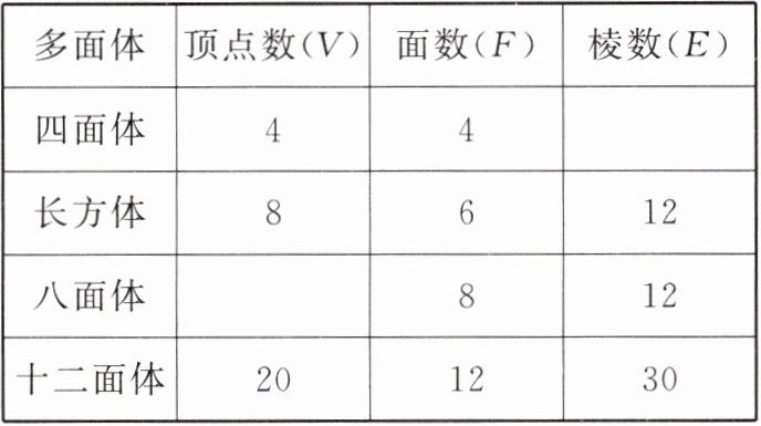 (1)四面体的棱数为6;八面体的顶点数为6.