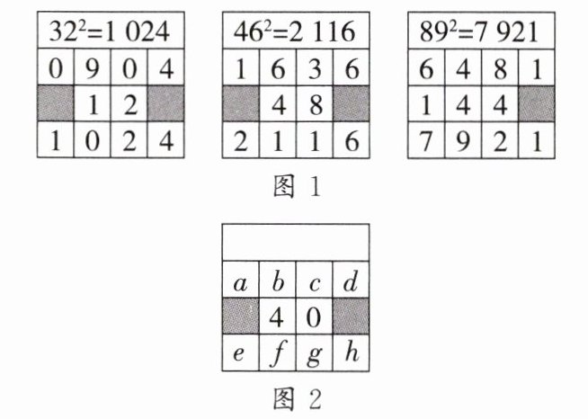 10. 在求两位数的平方时,可以用"列竖式"的方法进行计算,求解过程如图1所示.仿照图1,用"列竖式"的方法计算一个两位数的平方,部分求解过程如图2所示,则$a + b + c + d + e + f + g + h = $