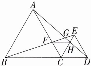 14. 如图,已知 $\triangle ABC$ 与 $\triangle CDE$ 都是等边三角形,点 $B$,$C$,$D$ 在同一条直线上,$AD$ 与 $BE$ 相交于点 $G$,$BE$ 与 $AC$ 相交于点 $F$,$AD$ 与 $CE$ 相交于点 $H$,连接 $FH$.给出下列结论:①$\triangle ACD\cong\triangle BCE$;②$\triangle AGB = 60^{\circ}$;③$BF = AH$;④$\triangle CFH$ 是等边三角形.其中正确结论的个数是(