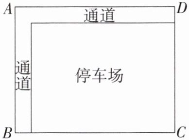 7. 为了解决停车难的问题,某小区计划将矩形空地ABCD改建,AD = 100m,AB = 80m.如图,将在矩形空地沿着边AD和AB修建宽度相同的通道,剩余部分为停车场.若停车场的面积为$6300m^2,$求通道的宽度.