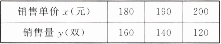 12.阳春三月,正是踏青的好时节.某品牌运动鞋很受顾客的喜爱,一家商场正在火热售卖该品牌运动鞋,每日销售量$y$(双)与销售单价$x$(元)之间存在一次函数关系,如下表所示.已知该品牌运动鞋的成本为150元/双.