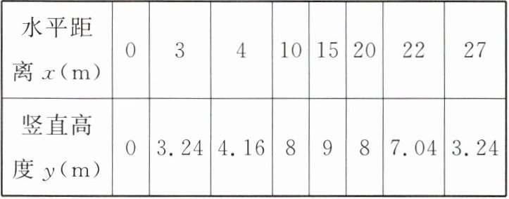 (1)根据题意可知抛物线过原点,设抛物线的表达式为$y = ax^{2}+bx(a \neq 0)$.由表格得,抛物线的顶点坐标为$(15,9)$,则$\begin{cases}-\frac{b}{2a}=15 \\-\frac{b^{2}}{4a}=9\end{cases}$,解得$\begin{cases}a = -\frac{1}{25} \\b = \frac{6}{5}\end{cases}$,则抛物线的表达式为$y = -\frac{1}{25}x^{2}+\frac{6}{5}x$.