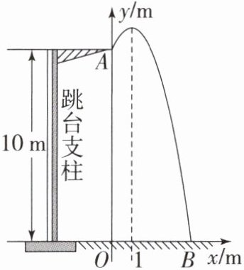 12. 一名运动员在$10m$高的跳台进行跳水,身体(看成一点)在空中的运动轨迹是一条抛物线,运动员离水面$OB的高度y$($m$)与离起跳点$A的水平距离x$($m$)之间的函数关系如图所示,运动员离起跳点$A的水平距离为1m$时达到最高点,当运动员离起跳点$A的水平距离为3m时离水面的距离为7m$.