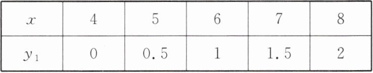 (1)由表中数据可知,y₁与x为一次函数关系,设解析式为y₁ = kx + b。把(4,0)和(5,0.5)代入,得{0 = 4k + b,0.5 = 5k + b},解得{k = 1/2,b = -2},故y₁与x的关系式为y₁ = 1/2x - 2。故答案为:1/2x - 2