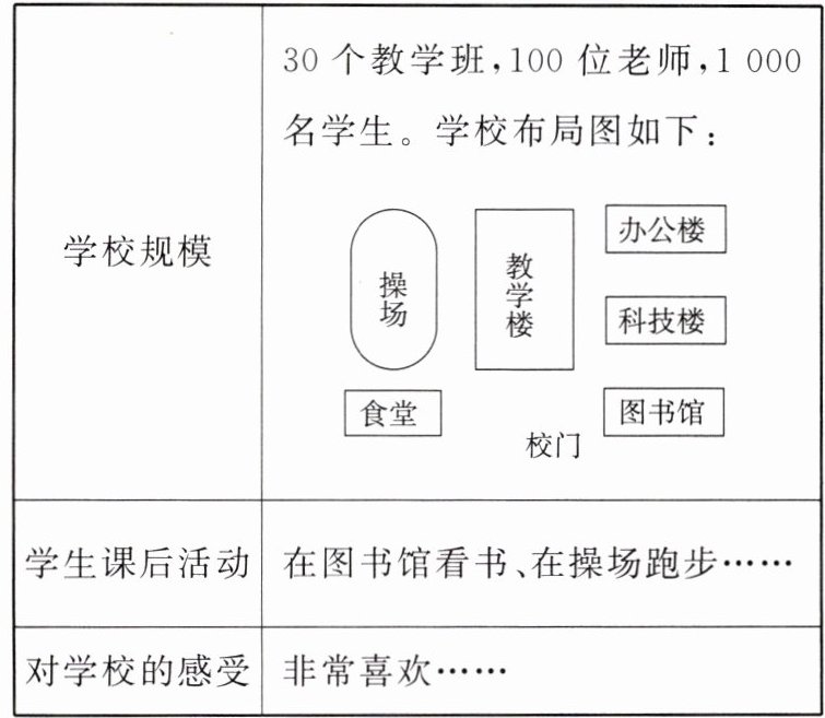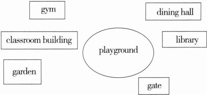 My school is very big, there are 30 classes, 100 teachers and 1,000 students in our school. Here is the map of our school, there are 5 buildings in our school. In the middle of our school is the classroom building. On the left of the classroom building is the playground. We often run and play on the playground. In front of the playground is the dining hall. How about the library? It is on the right of the classroom building and near the school gate. I like reading books there. Behind the library is the science building, and behind the science building is the office building.