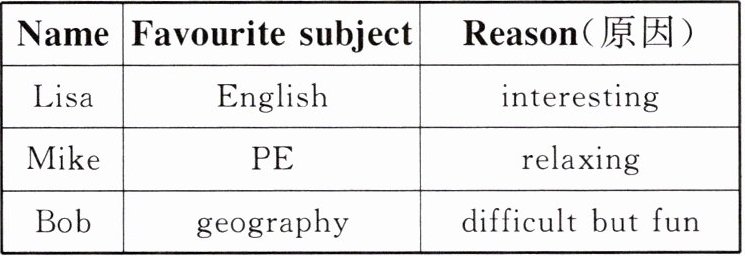 Lisa's favourite subject is English. Because she thinks it's interesting. Mike likes PE best. Because he thinks it's relaxing. What about Bob? What's his favourite subject? His favourite subject is geography. Why does he like it? Because it is difficult but fun.