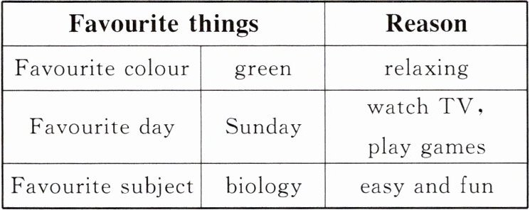I have a good friend. Her name is Anna. Her favourite colour is green. Why? Because it's relaxing. Anna's favourite day is Sunday. Because she can watch TV and play games on Sunday. What's her favourite subject? Oh, her favourite subject is biology. She thinks it's easy and fun. What about you, my dear friend?