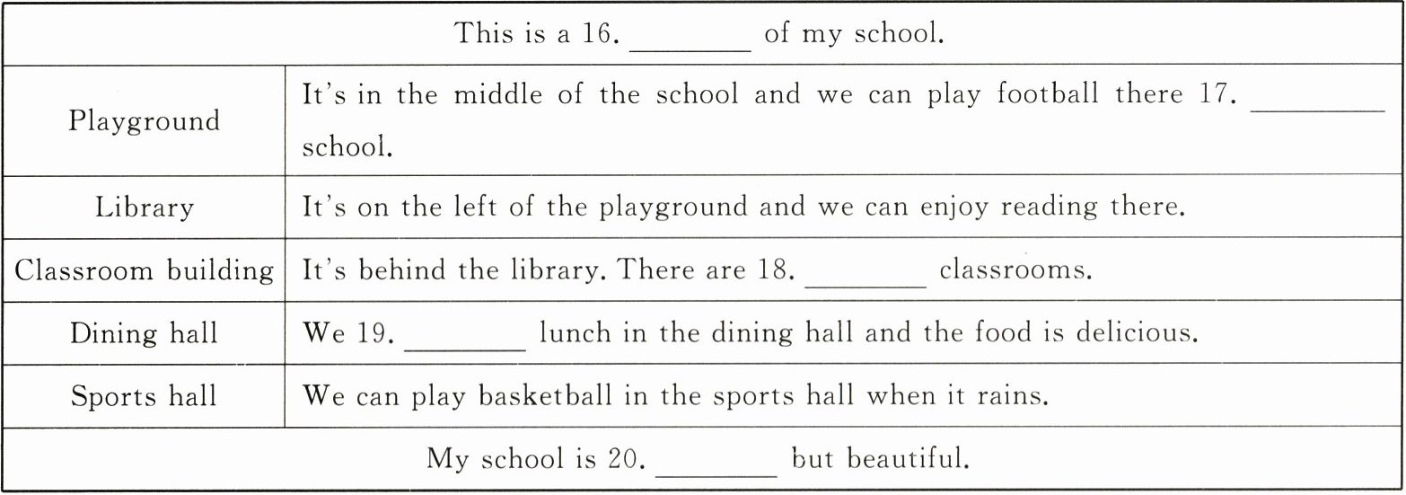 Our school is very big. There ______ 25 classes and 1,500 students in our school. There are two classroom buildings and ______ teachers' building. In front of the office building, you can see a beautiful garden (花园). There are ______ flowers and some grass. Between the office building ______ the dining hall is the library. There are lots of ______ in the library. We often ______ books in it. ______ the right of the library is a big playground. We like doing sports there. Our classroom is very clean. There are 45 students in my class.