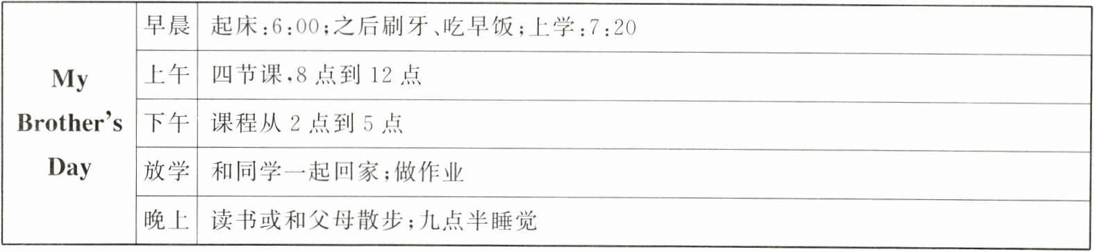 B. One possible version: My Brother's Day I have a brother named Jack. This describes my brother's daily routine. He usually gets up at 6:00 a.m. After that,he brushes his teeth and has breakfast. He goes to school at about 7:20 in the morning. He has four classes in the morning,from 8:00 to 12:00. The classes in the afternoon are from 2:00 to 5:00. After school,he goes home with his classmates. After he gets home,he does his homework. In the evening,he either reads a book or takes a walk with our parents. He goes to bed at 9:30 p.m. I think he leads a healthy life. He is busy,but he is very happy.