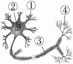 解析:选B。题图中①是树突、②是细胞核、③是轴突、④是神经末梢,A选项错误。神经元的基本结构包括胞体和突起两部分,B选项正确。神经元的细胞核在胞体内,C选项错误。神经元既能接收信息,又能传出信息,D选项错误。