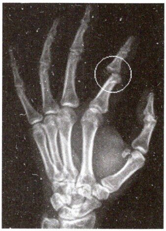 10. 某同学接快速飞过来的篮球时不得要领,造成手受伤。下图是他受伤部位的X光片,他手部骨头可能发生了(